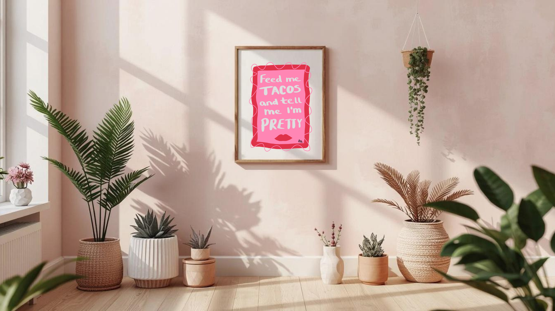 Feed Me Tacos and Tell Me I’m Pretty: Turn up the personality in your space with, a vibrant wall art print in contrasting pink and red. This playful, cheeky design is perfect for kitchens, dining rooms, home bars, or gallery walls, adding a pop of colour and humour wherever it hangs.